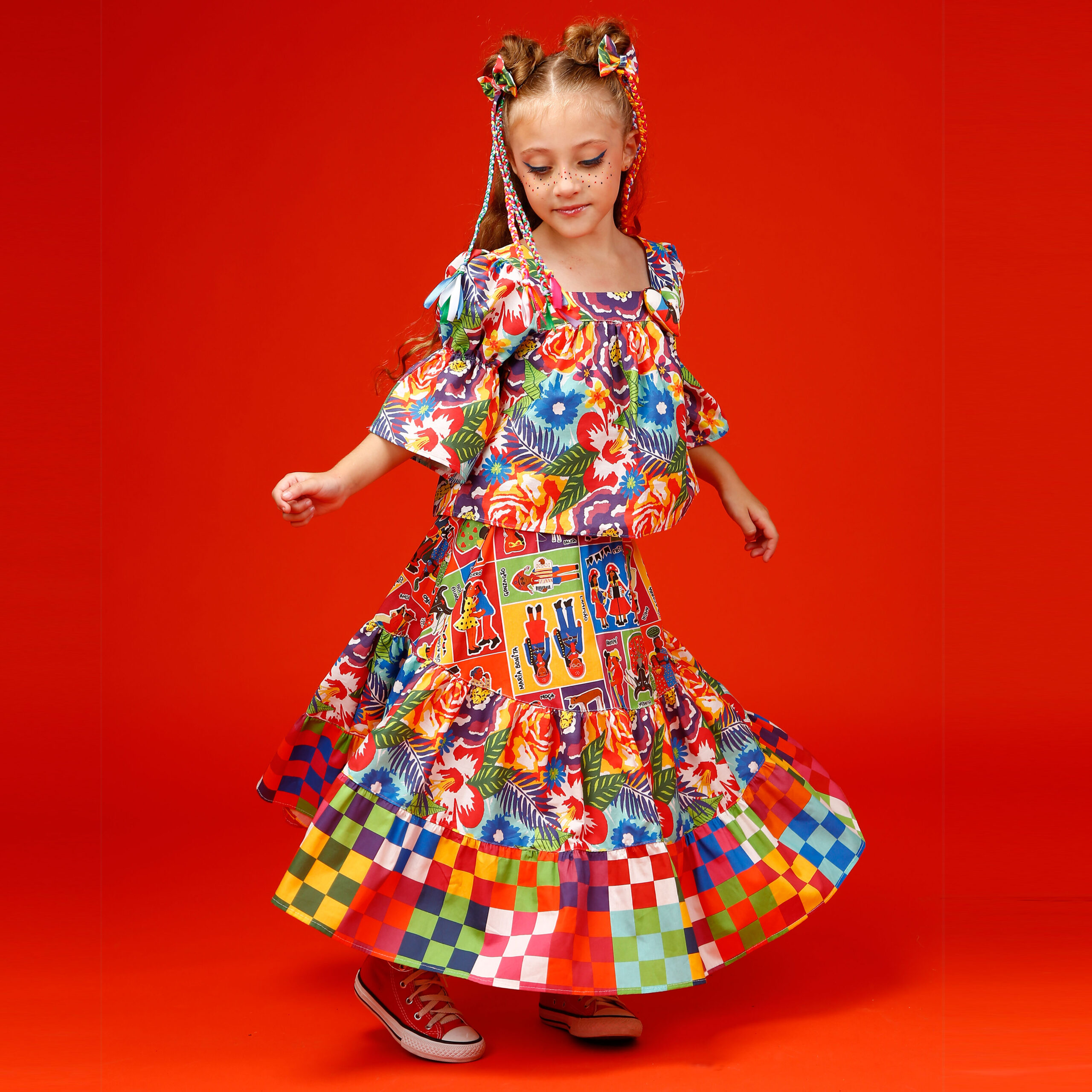 A localização de elementos da estampa na blusa pode variar de acordo com o corte do tecido.