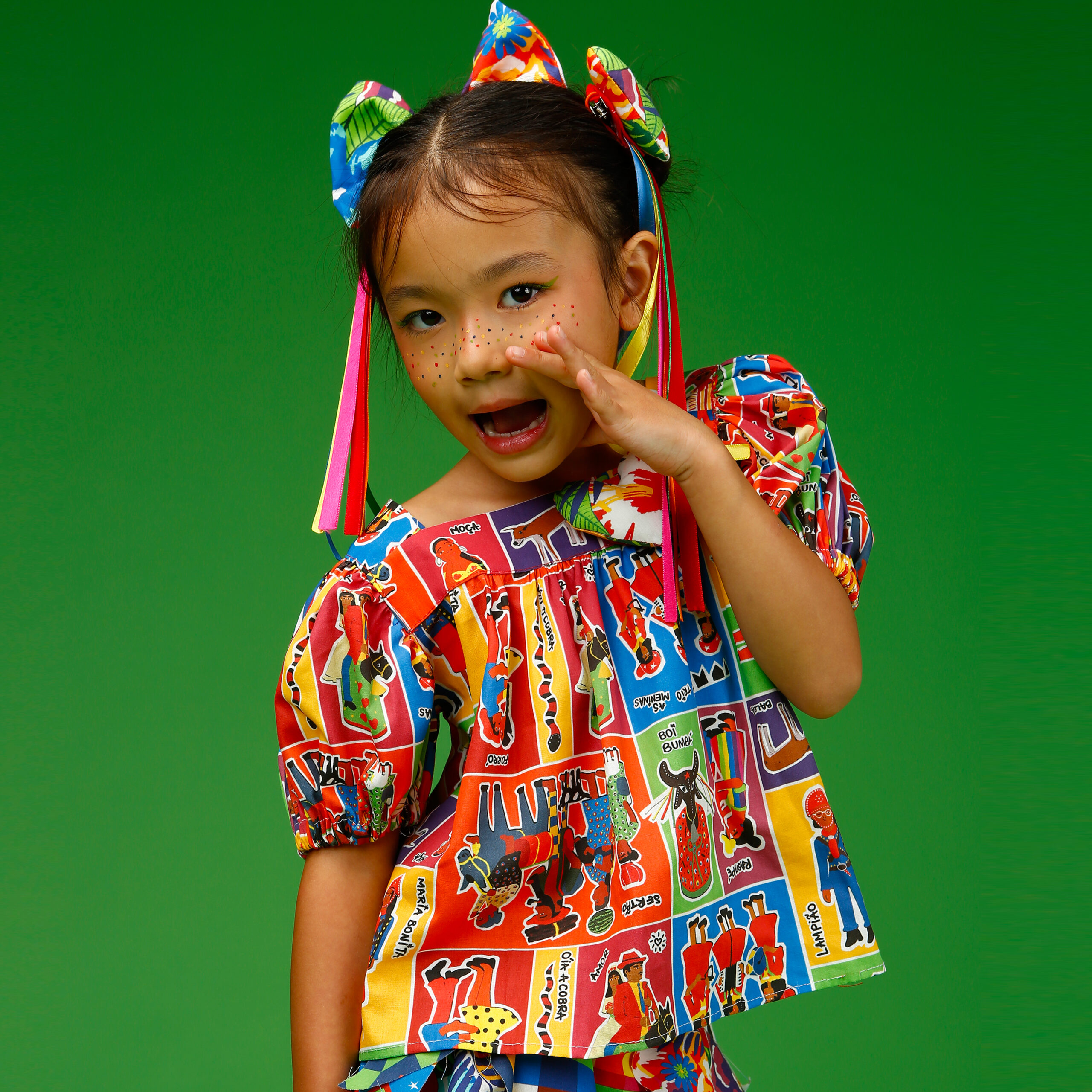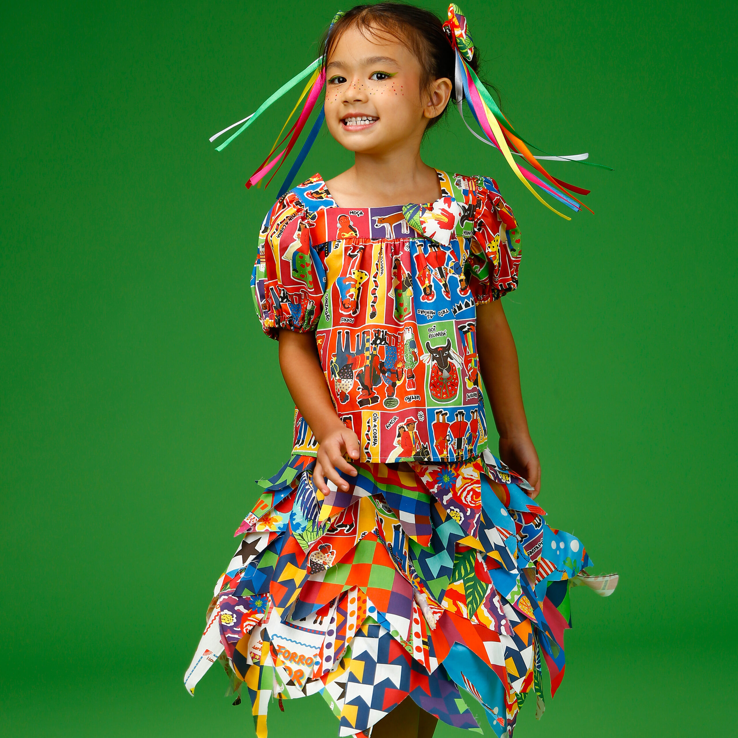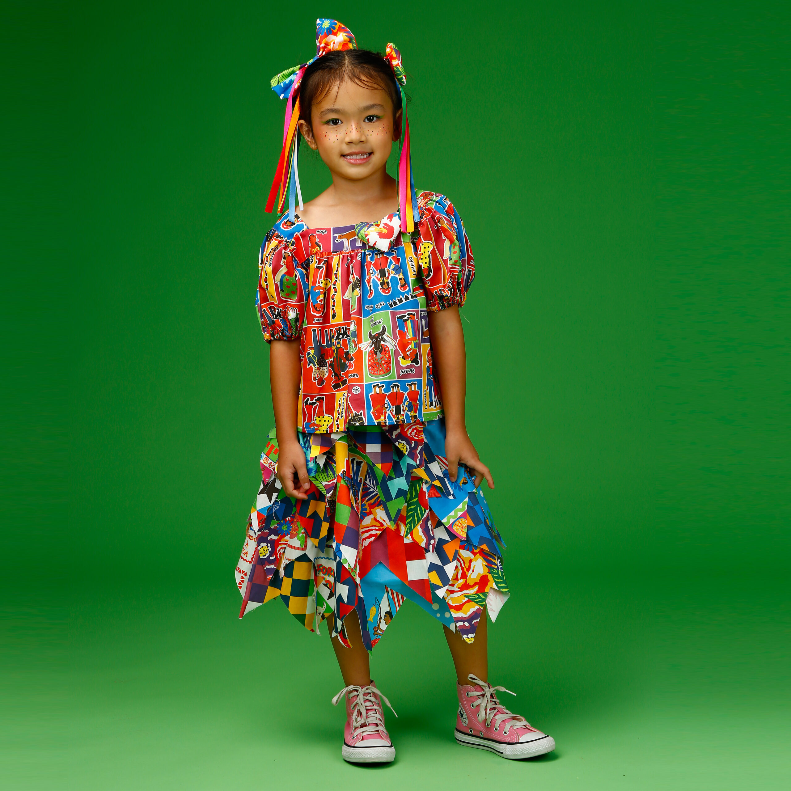 A localização de elementos da estampa na blusa pode variar de acordo com o corte do tecido.