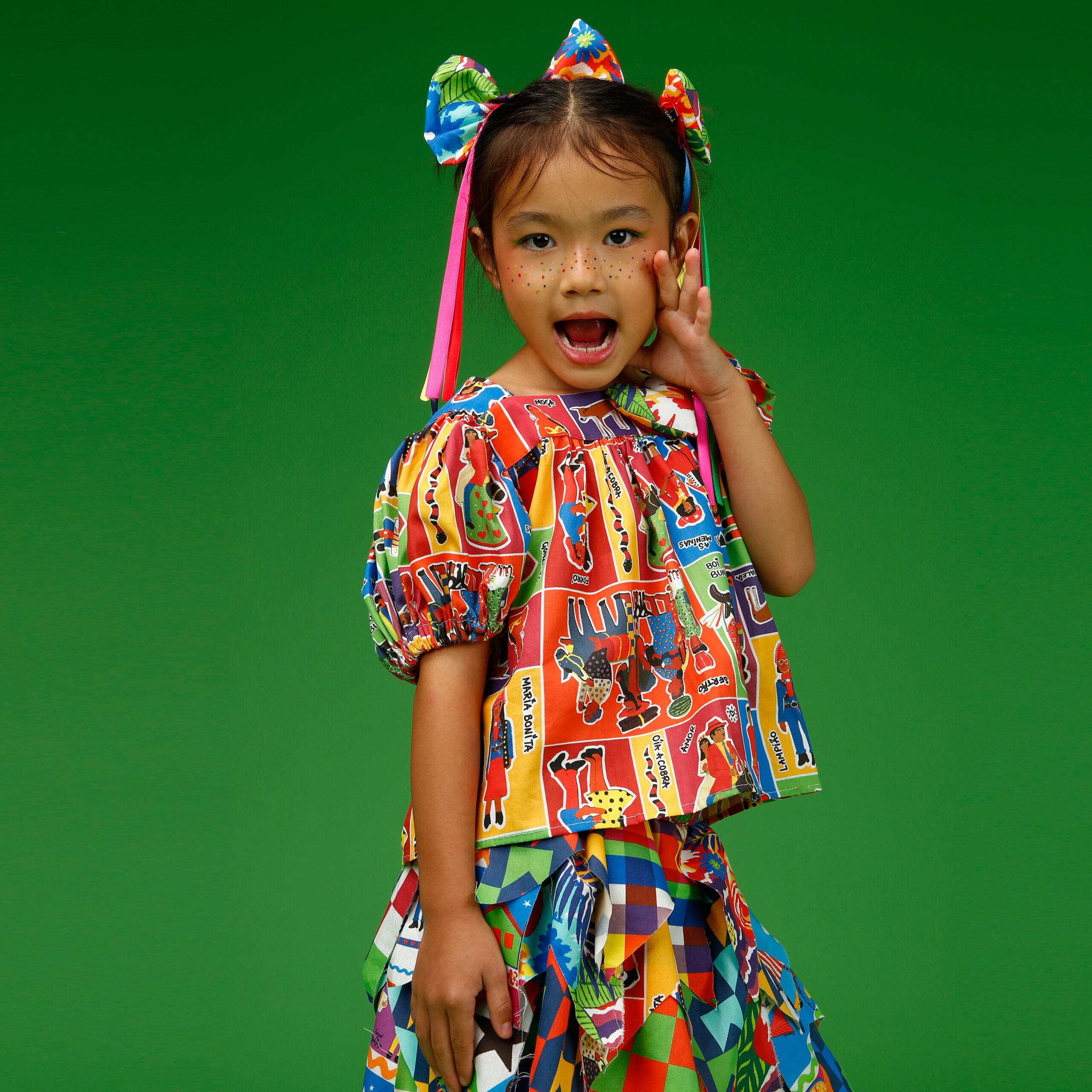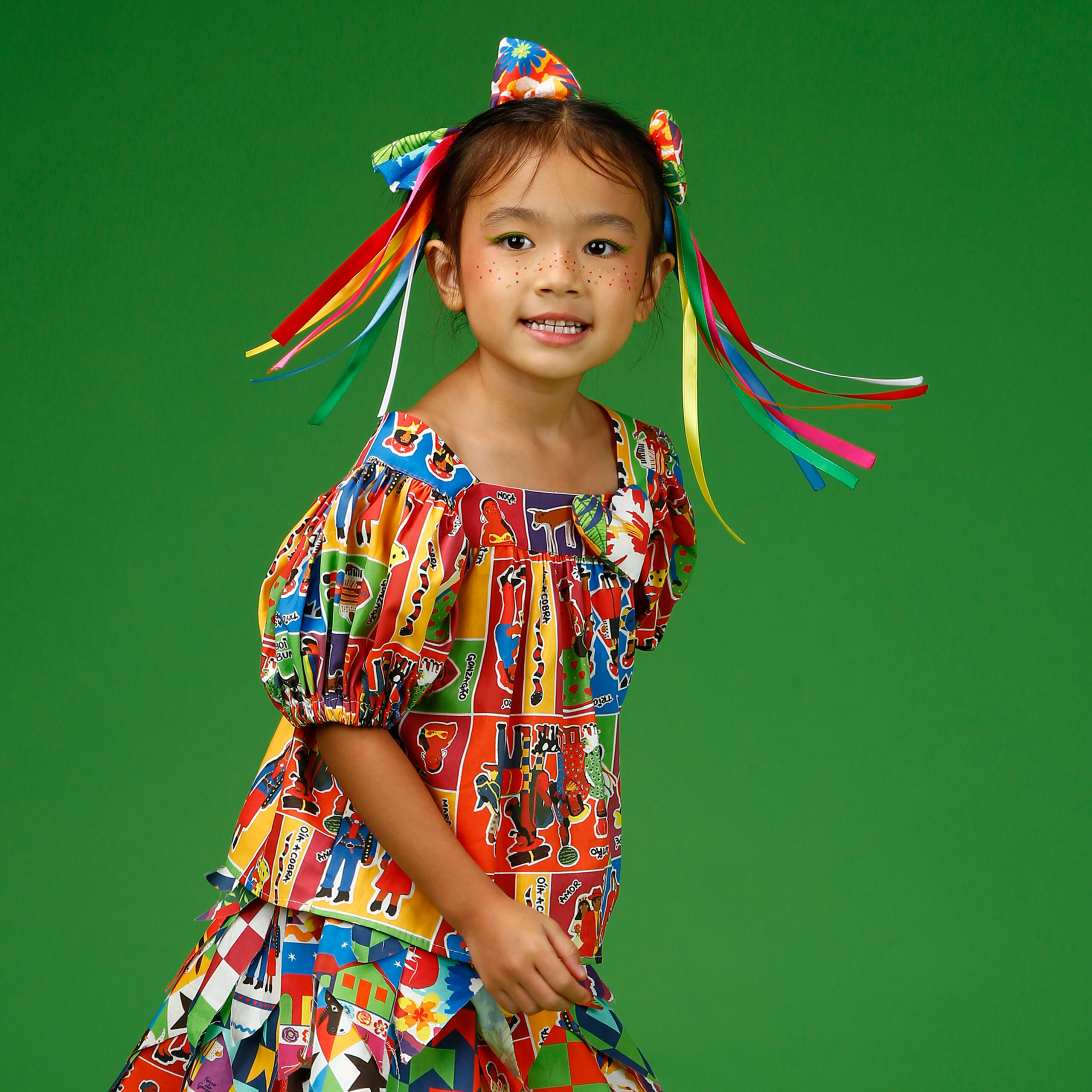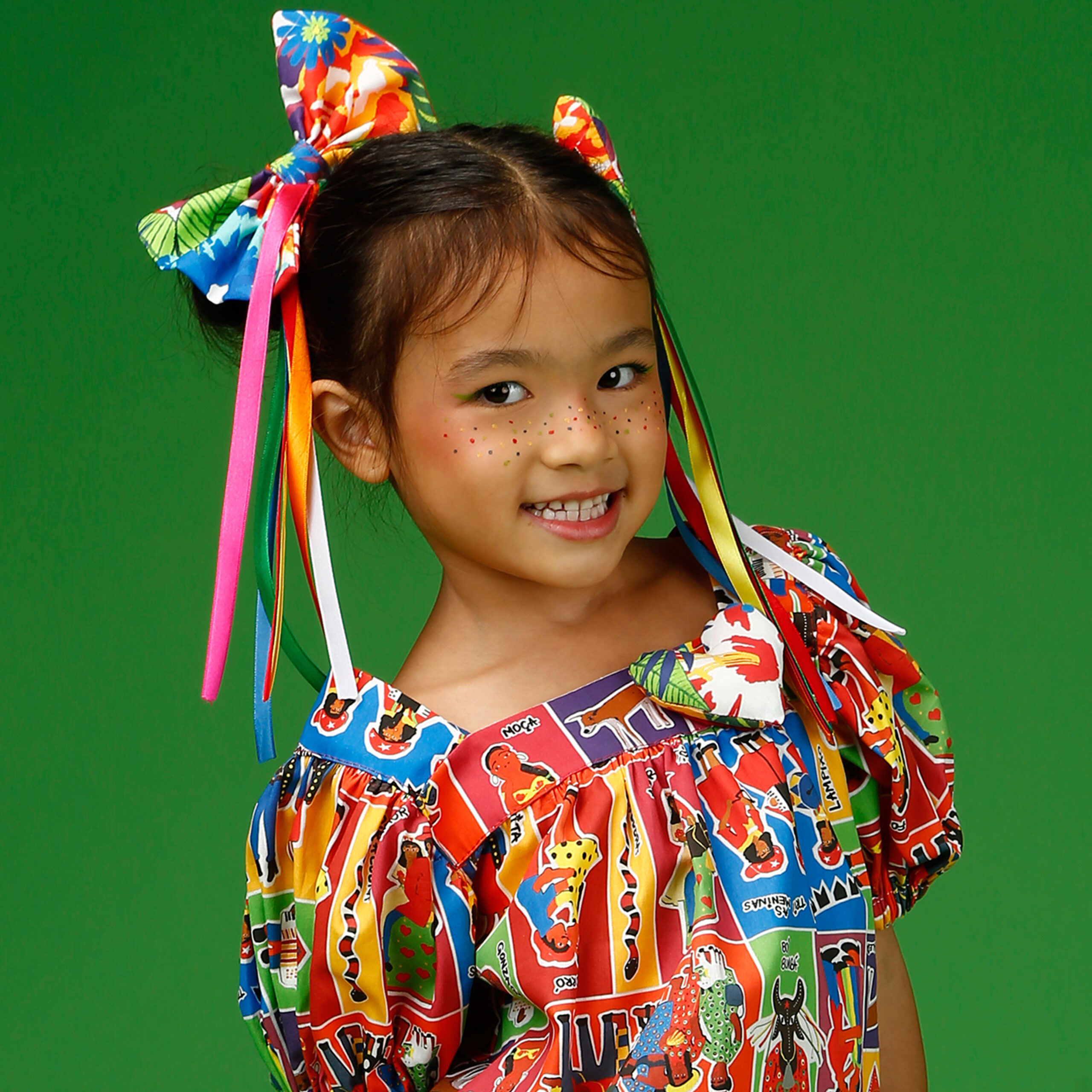 A localização de elementos da estampa no laço pode variar de acordo com o corte do tecido.