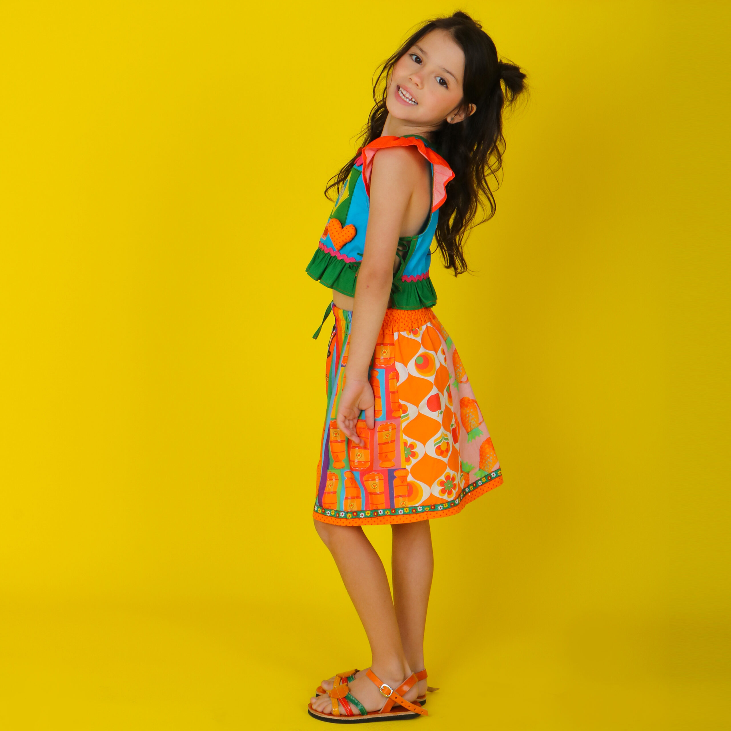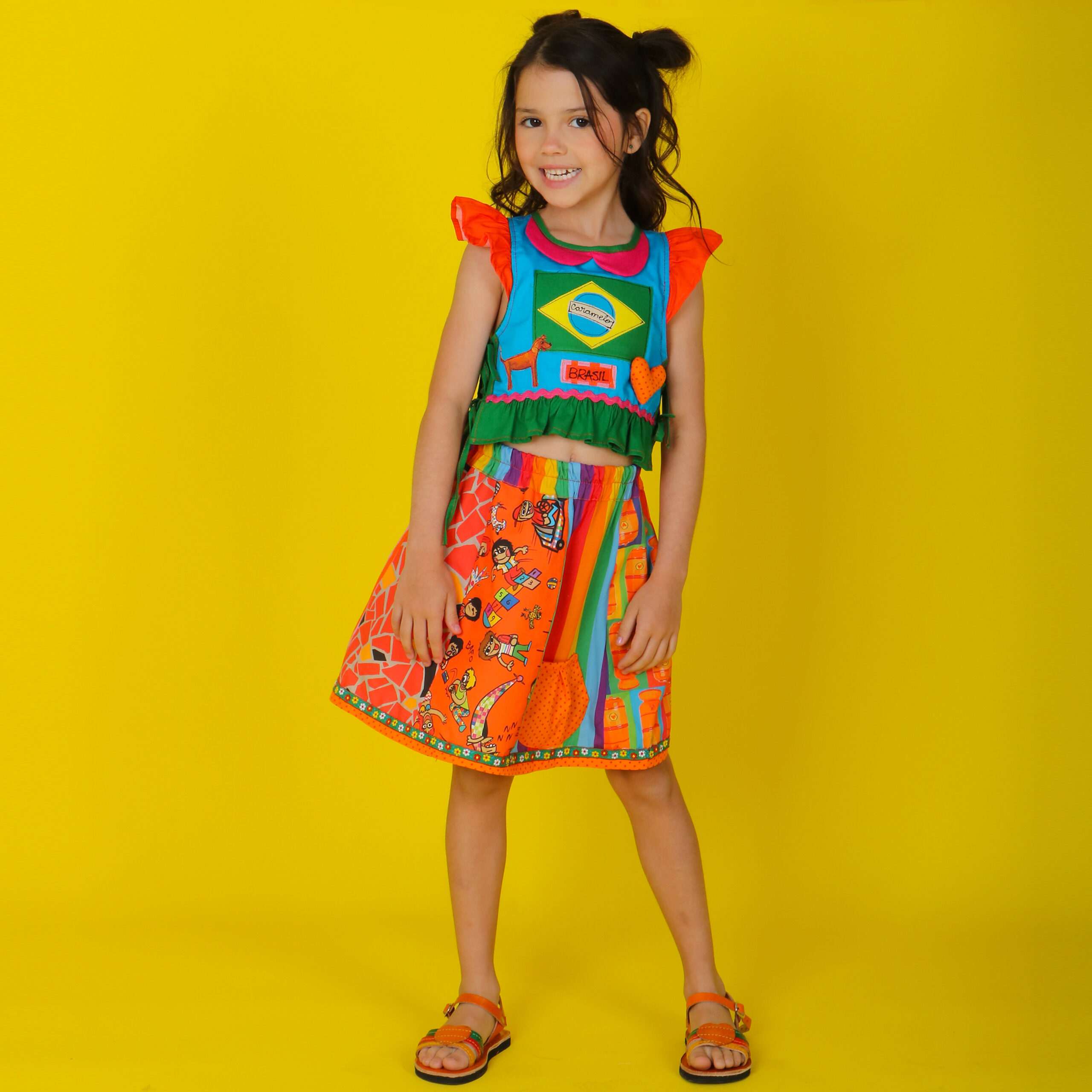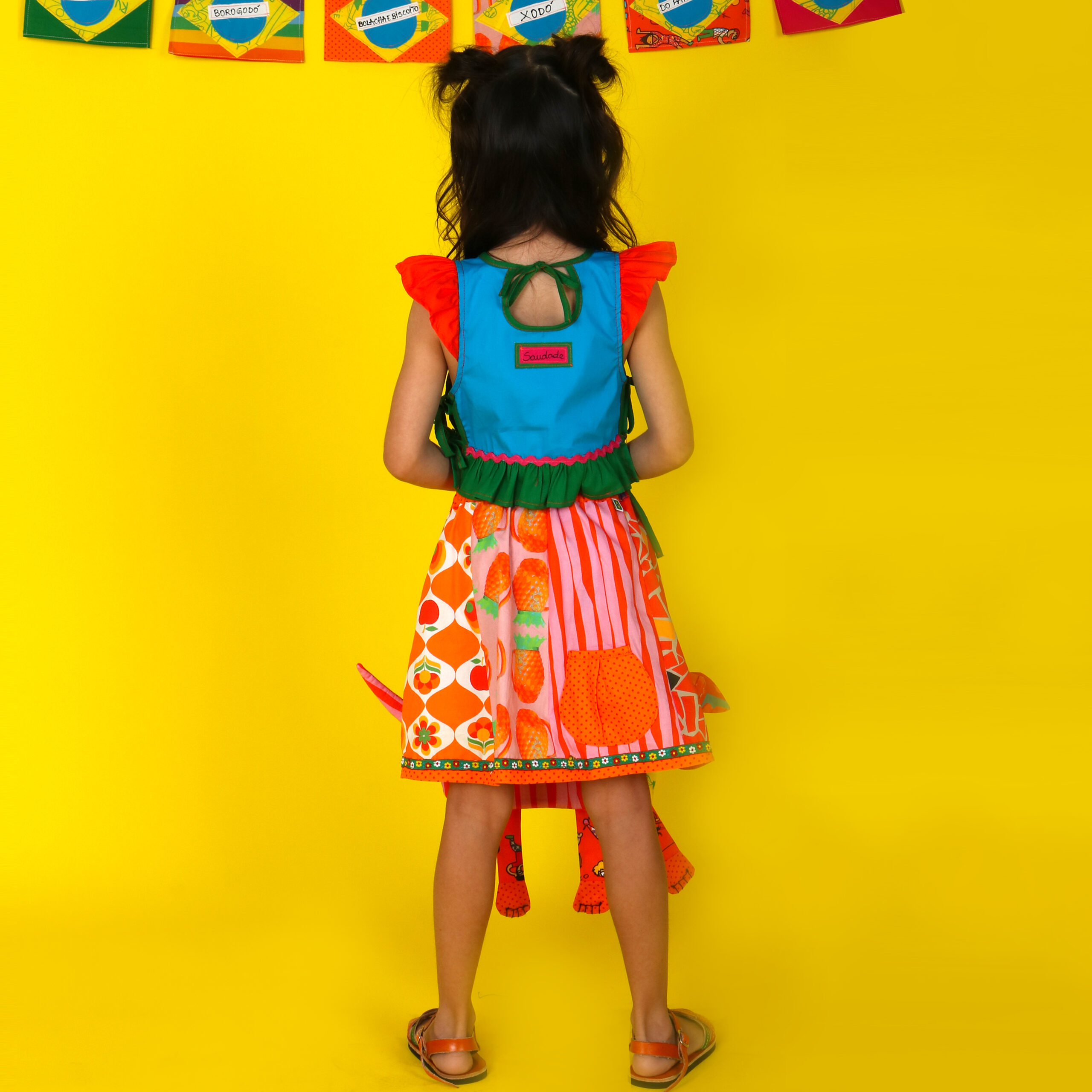 A localização de elementos da estampa na saia pode variar de acordo com o corte do tecido.