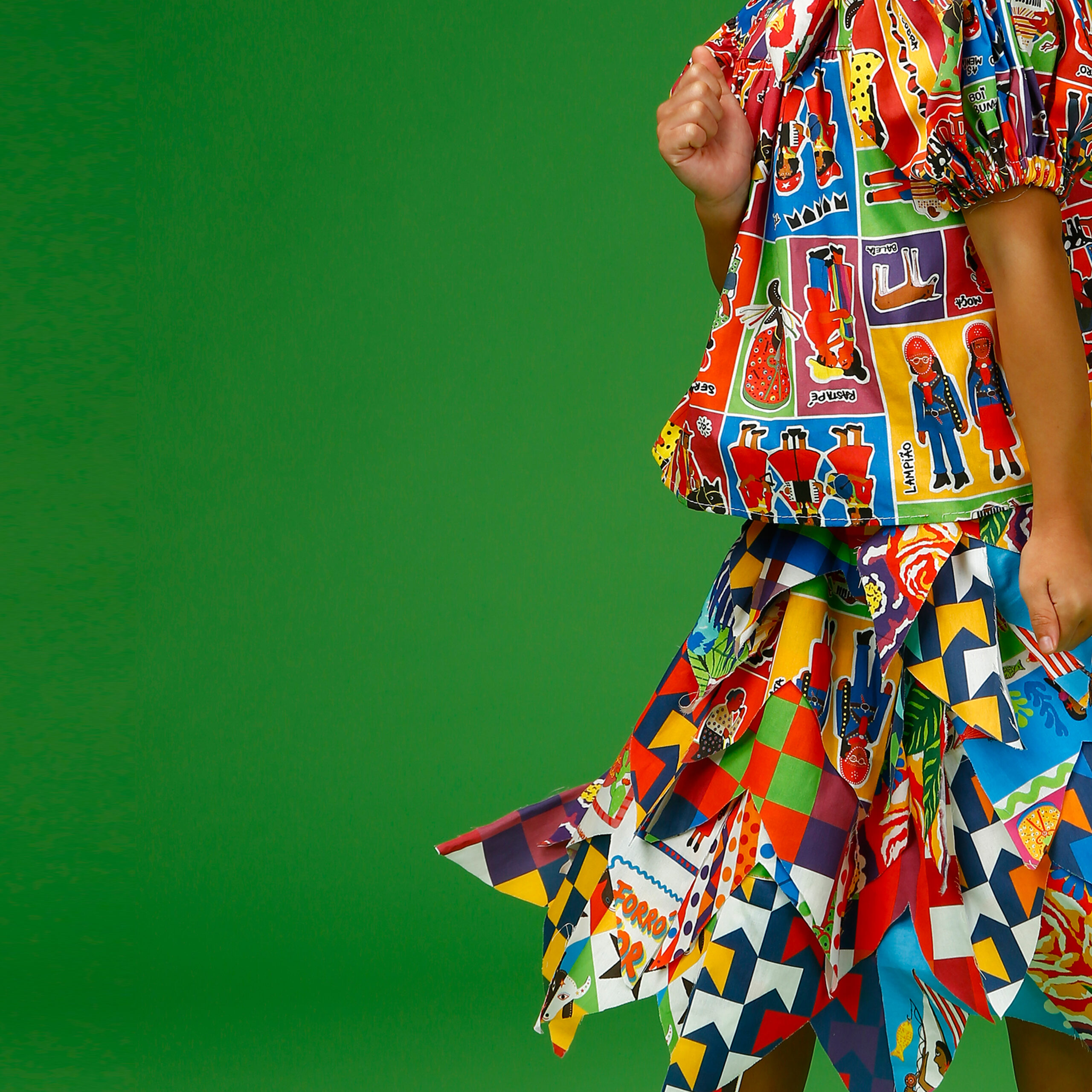 A localização de elementos da estampa na saia pode variar de acordo com o corte do tecido.