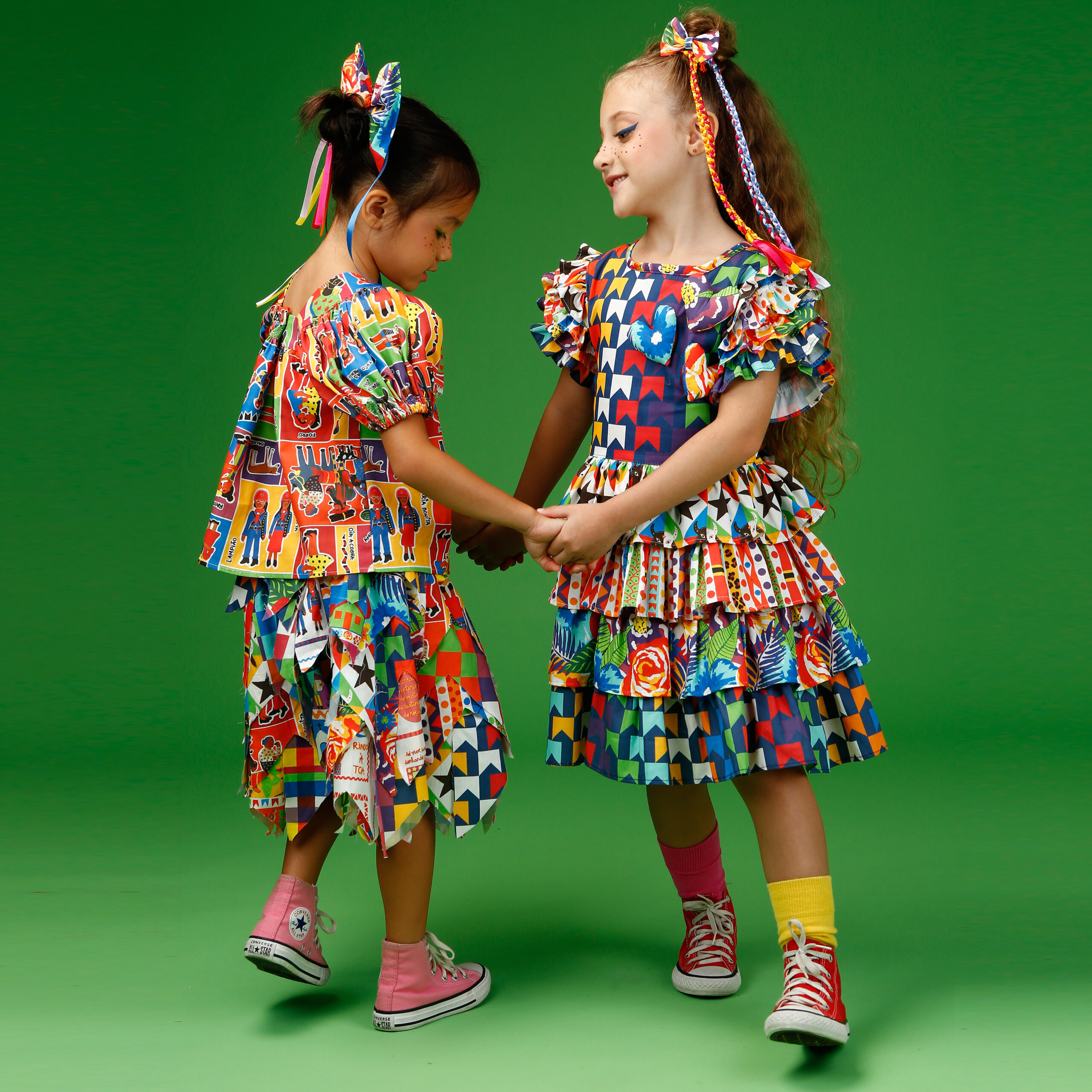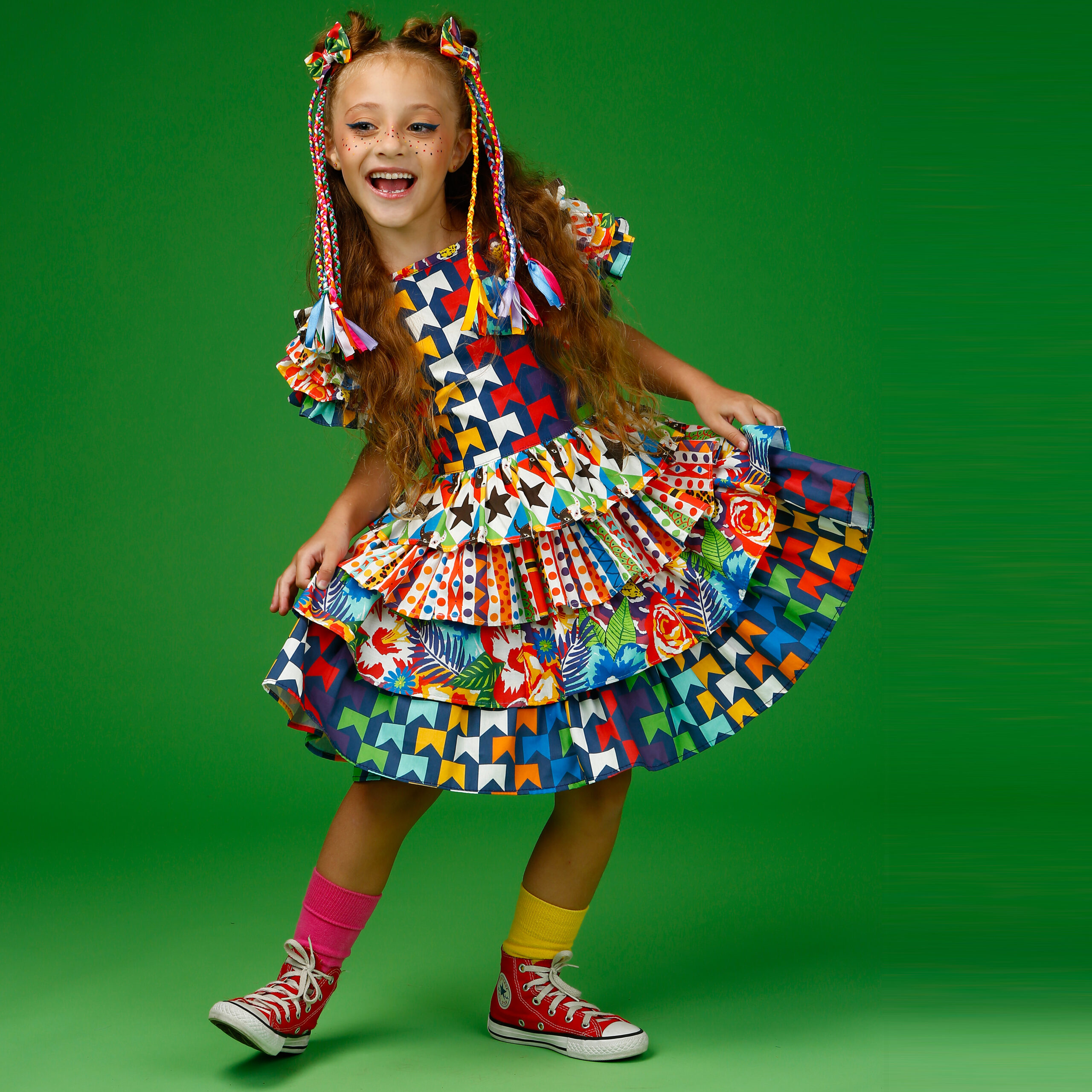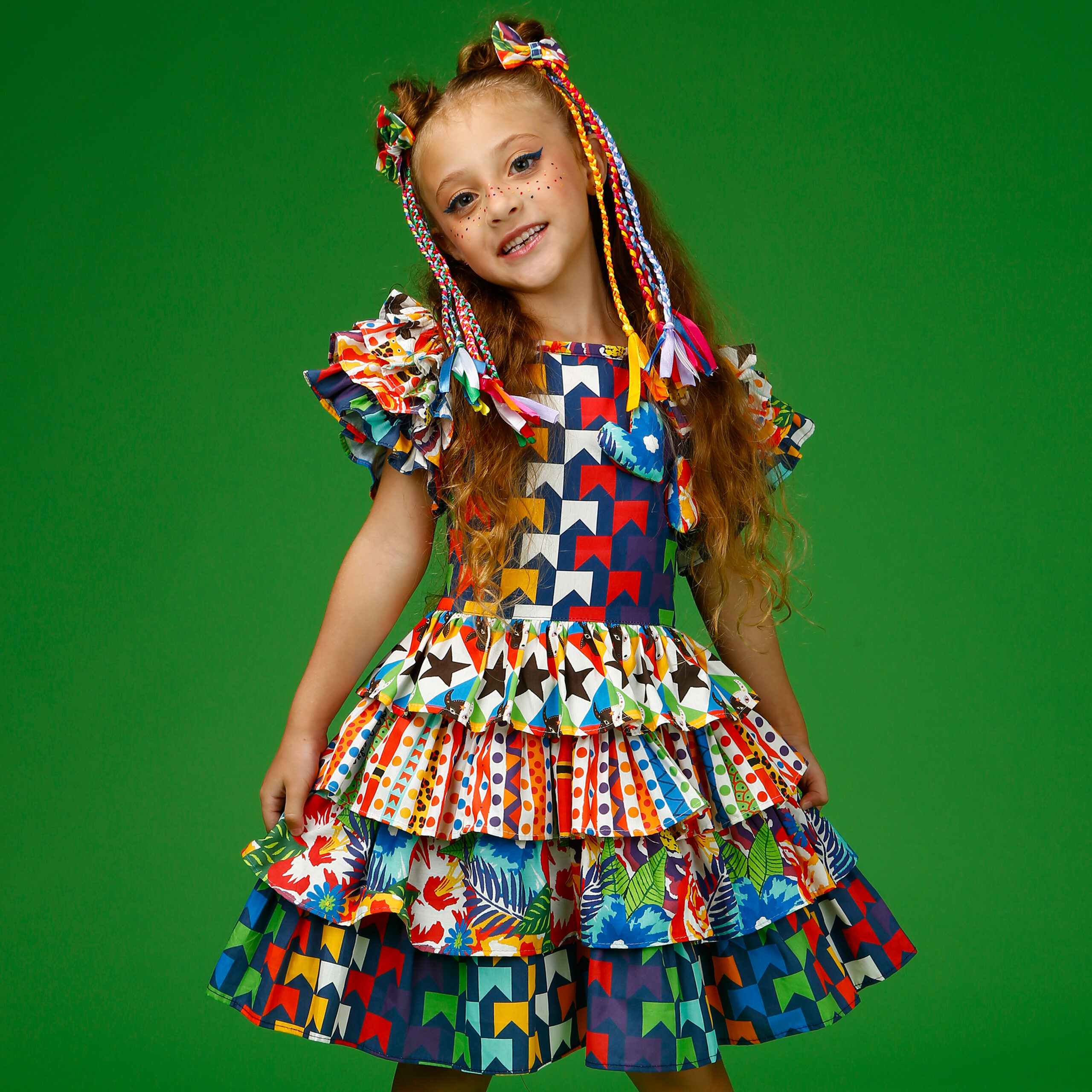 A localização de elementos da estampa no vestido pode variar de acordo com o corte do tecido.