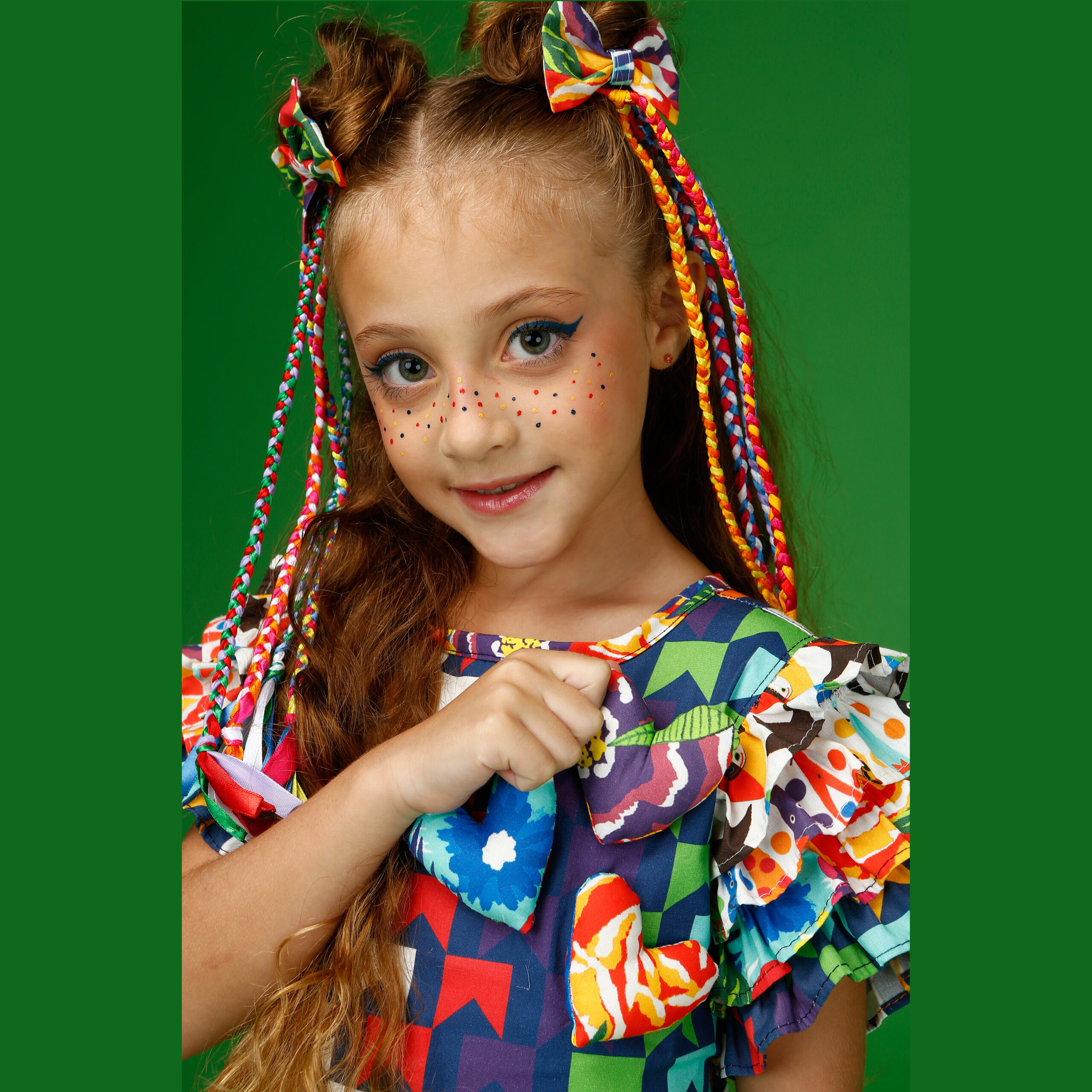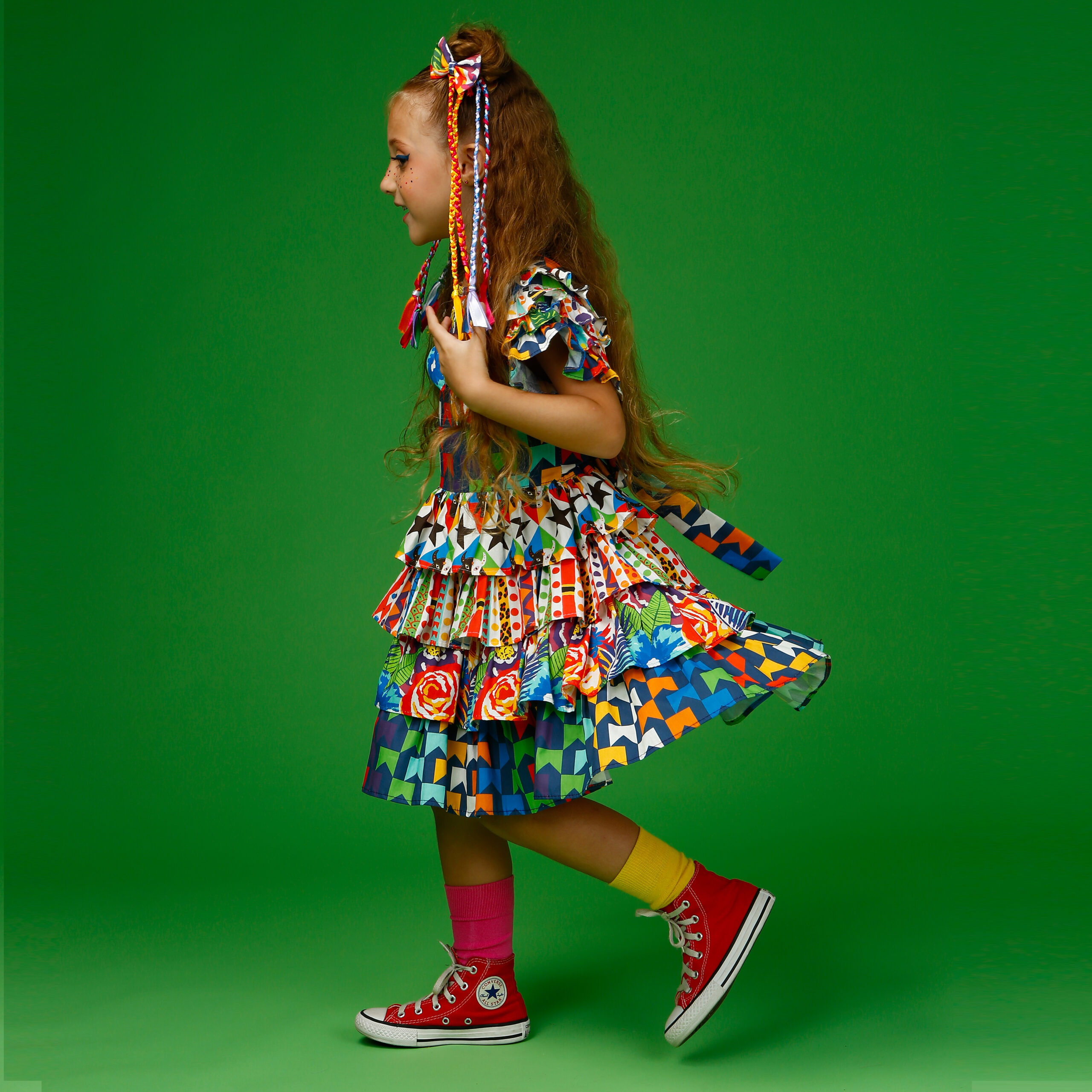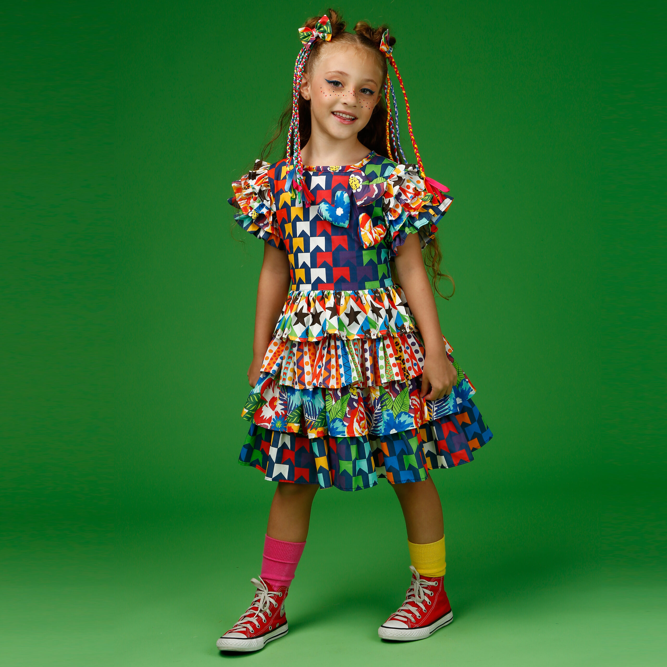 A localização de elementos da estampa no vestido pode variar de acordo com o corte do tecido.