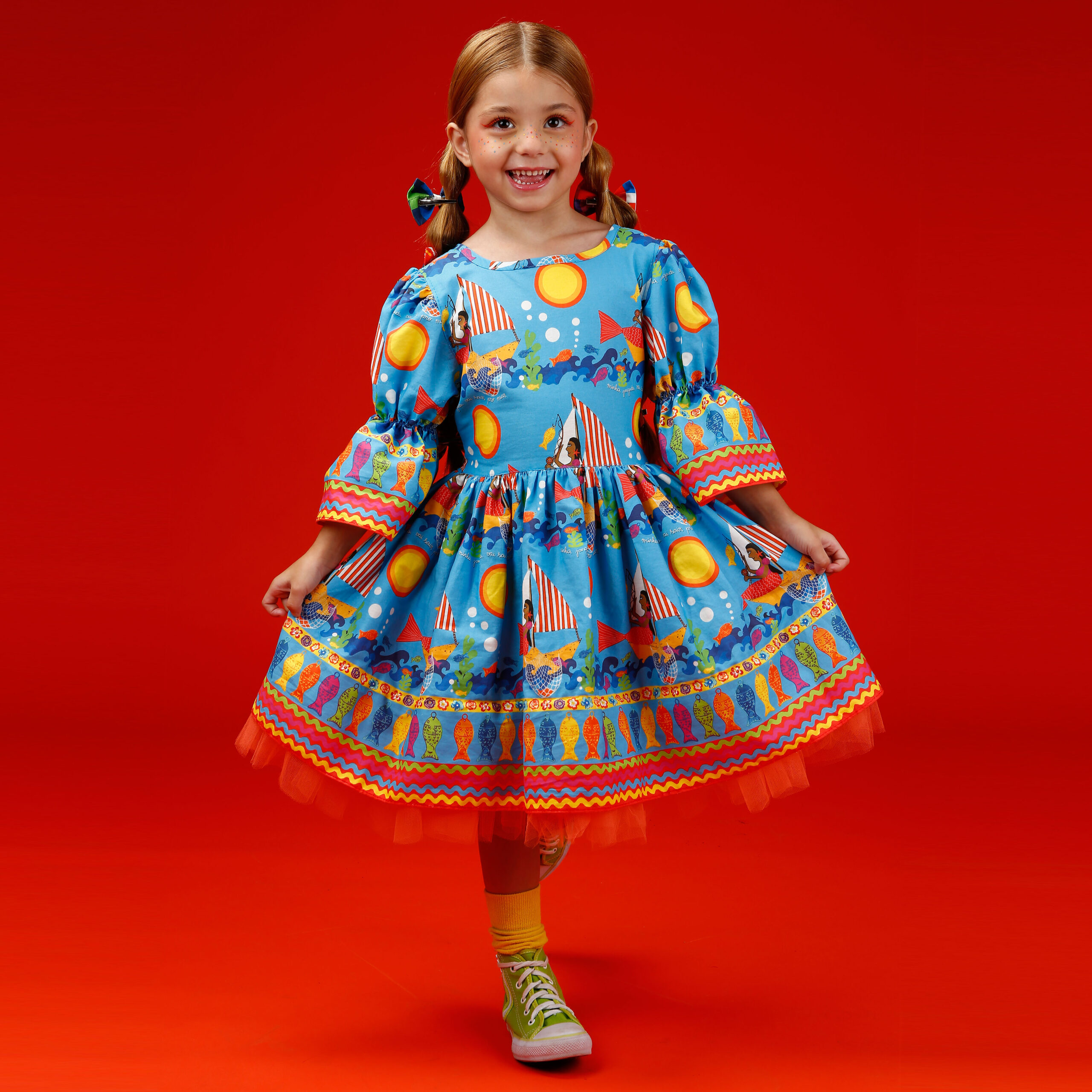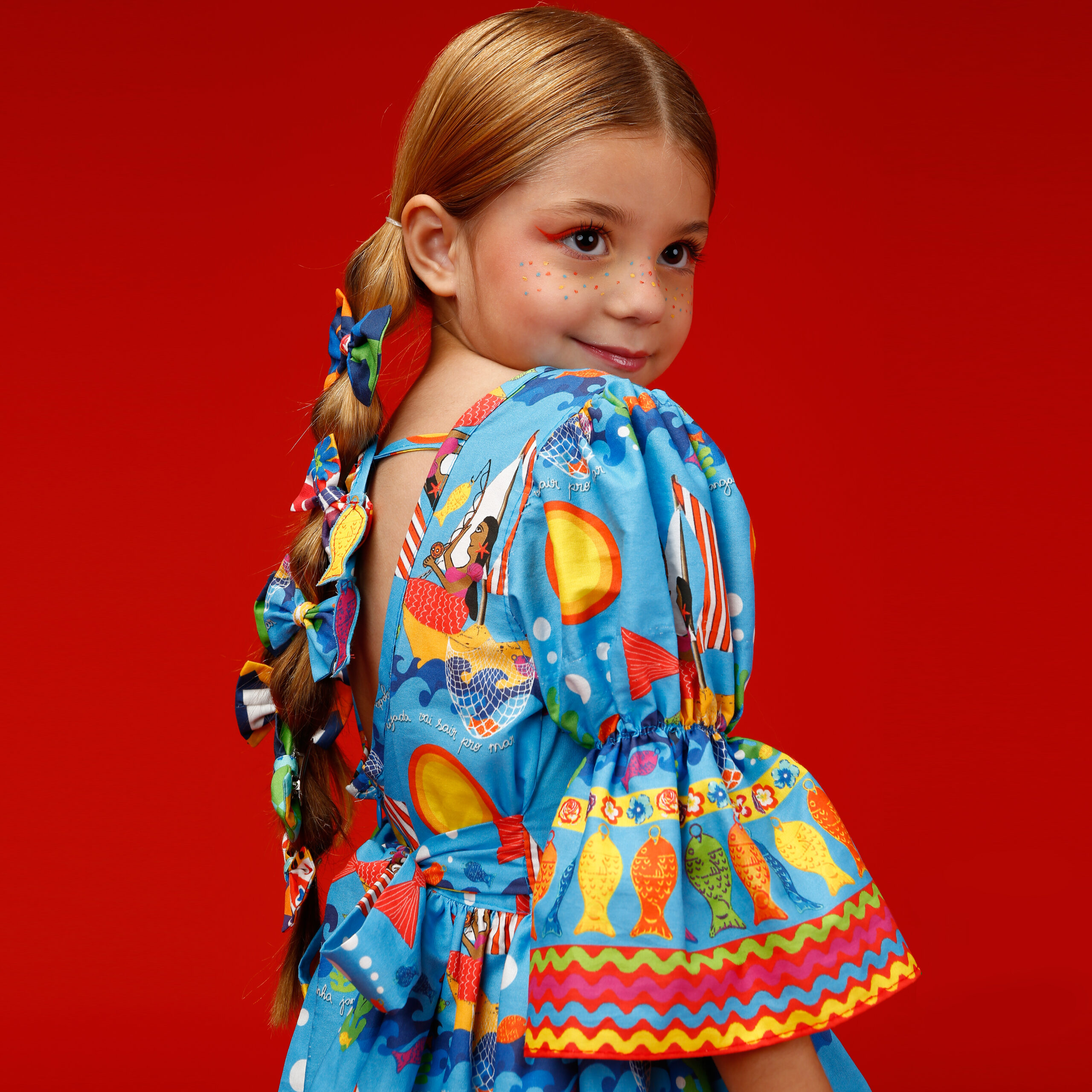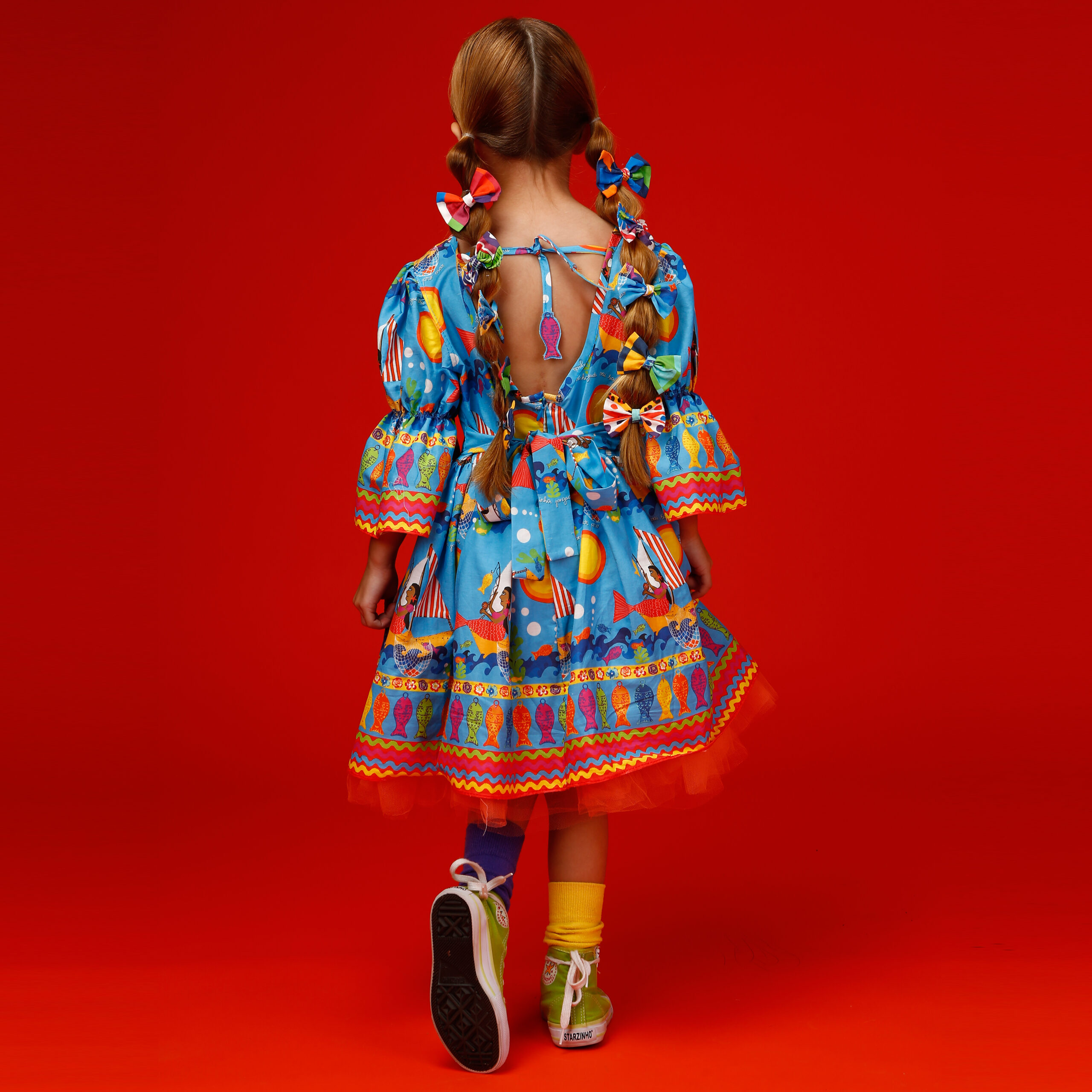 A localização de elementos da estampa no vestido pode variar de acordo com o corte do tecido.