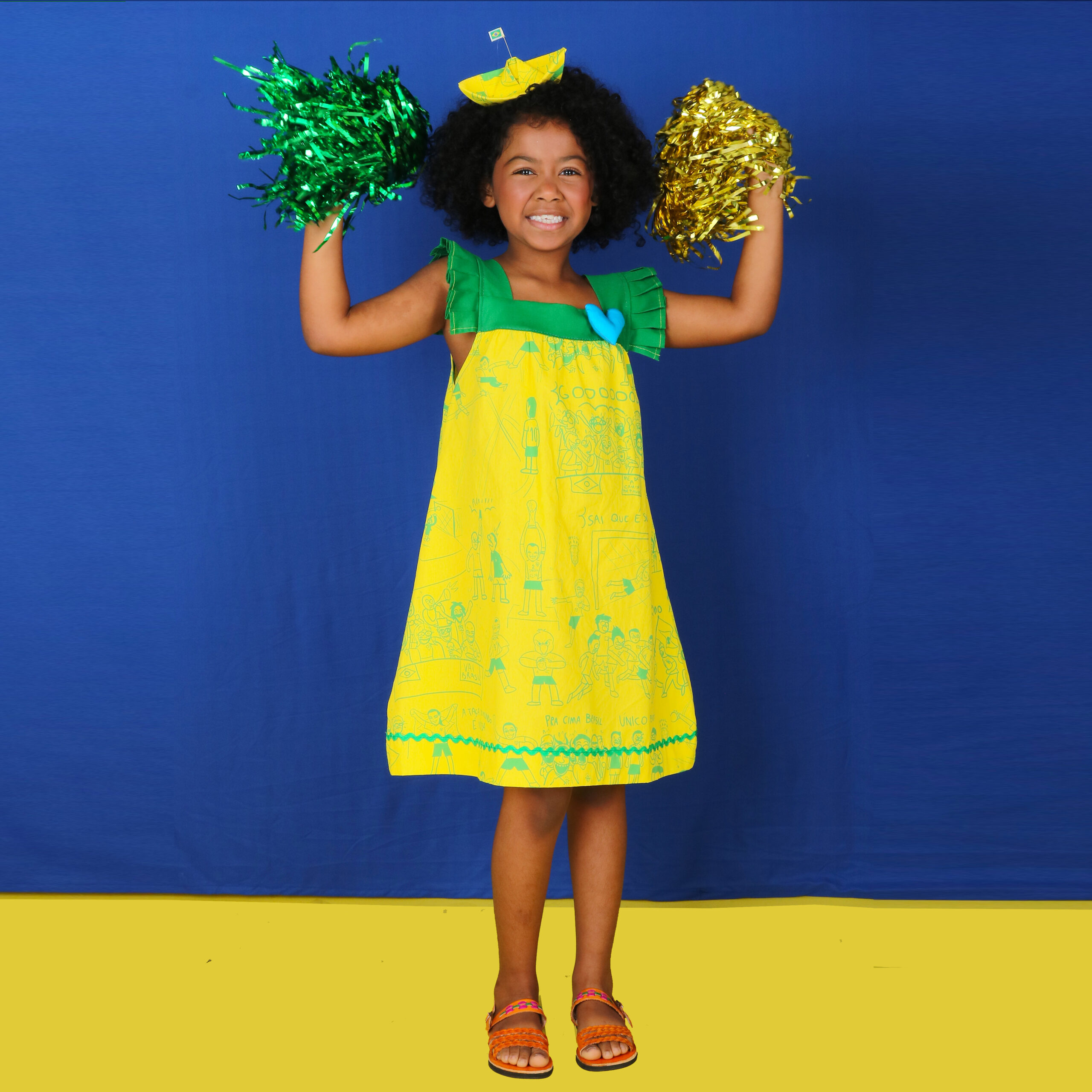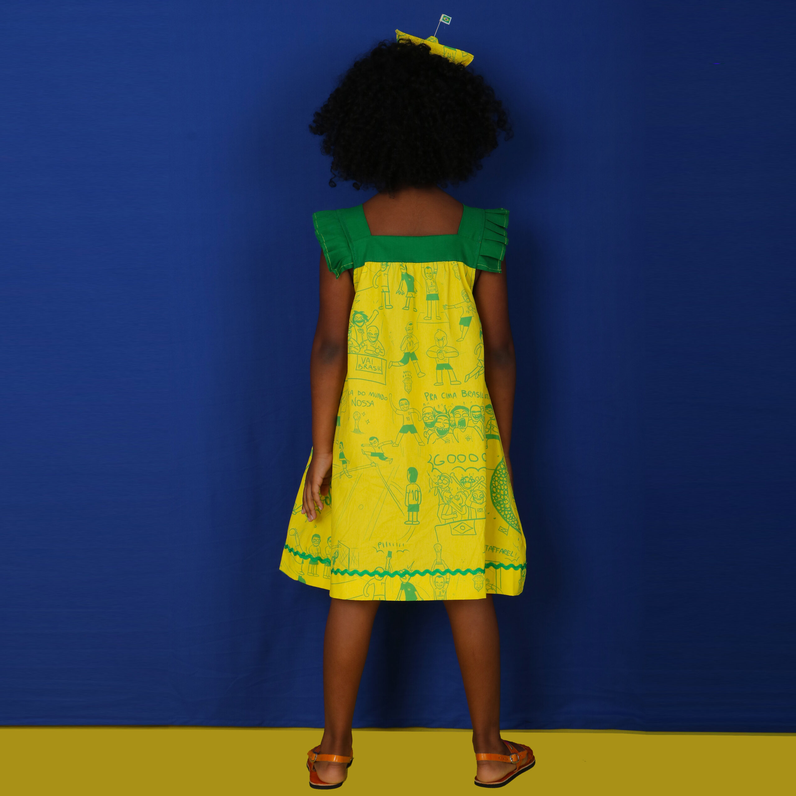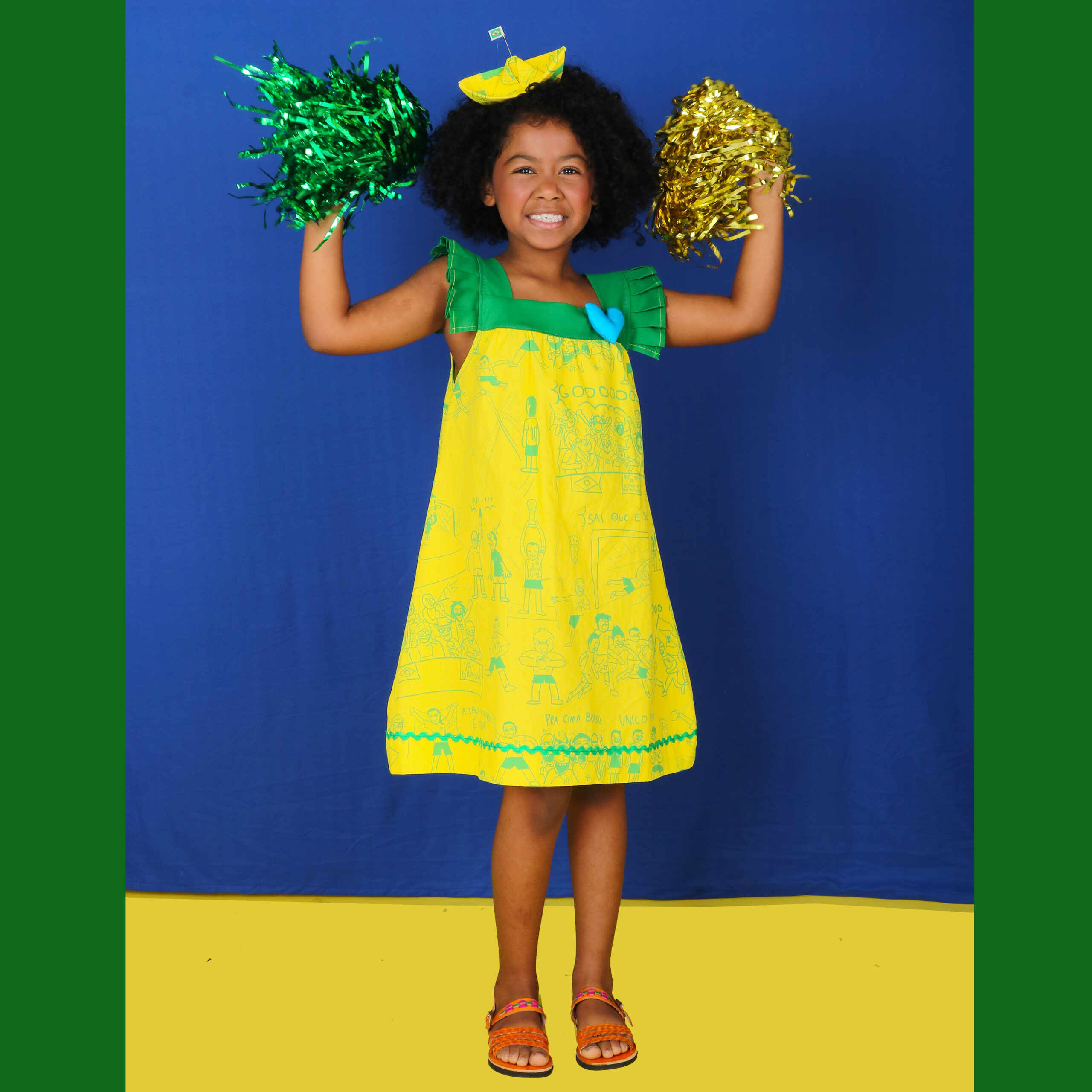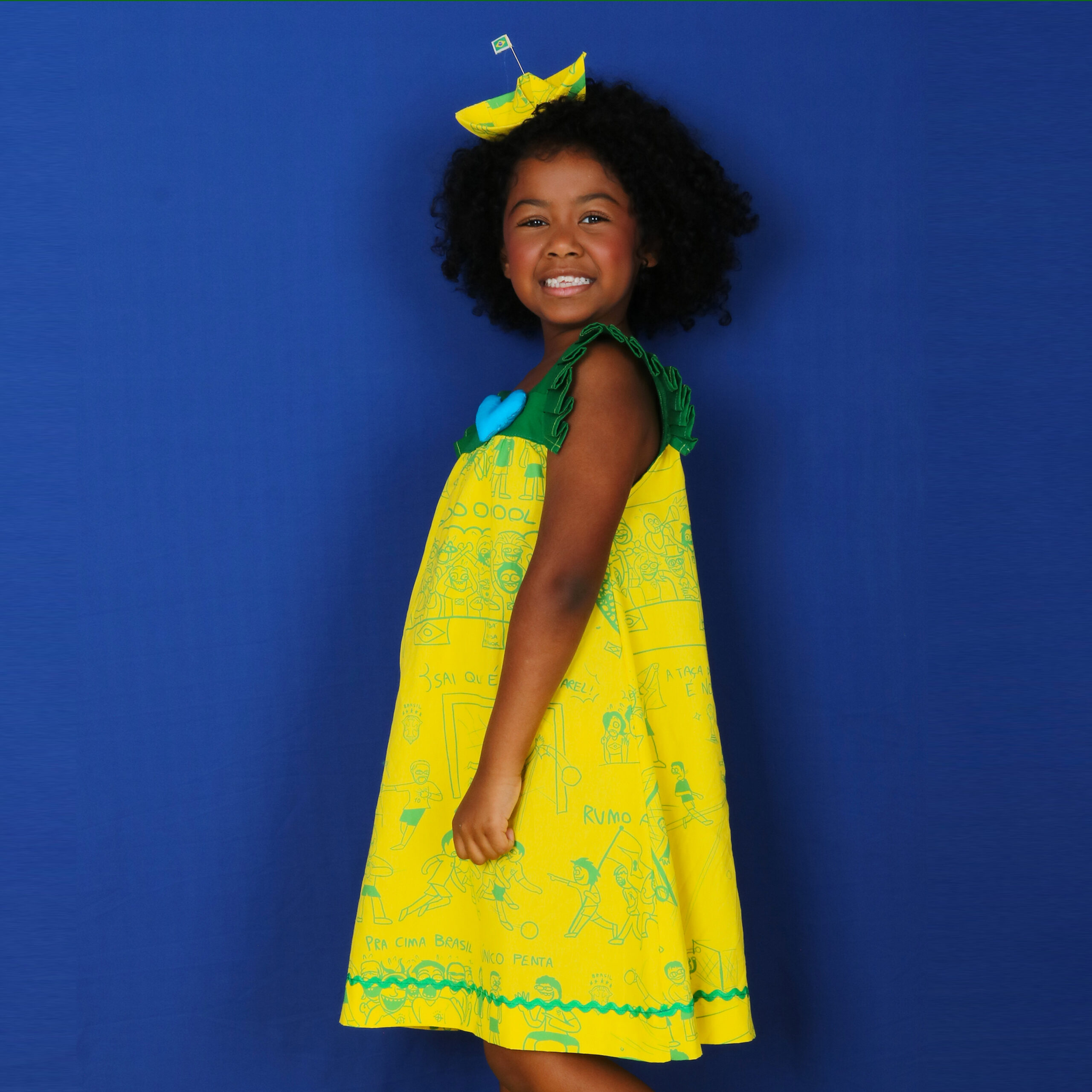 A localização de elementos da estampa no vestido pode variar de acordo com o corte do tecido.